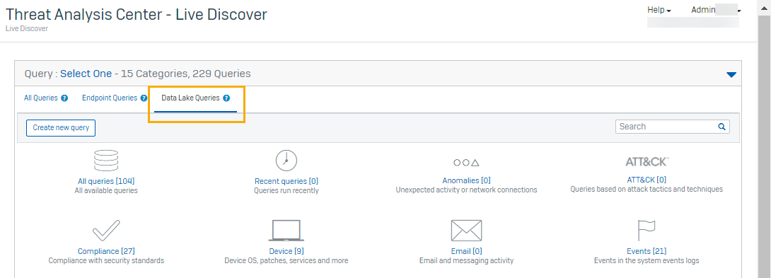 「Data Lake クエリ」をクリックし、使用するカテゴリ (例:「ファイル」など) を選択します。選択したカテゴリ内のクエリの一覧が表示されます。