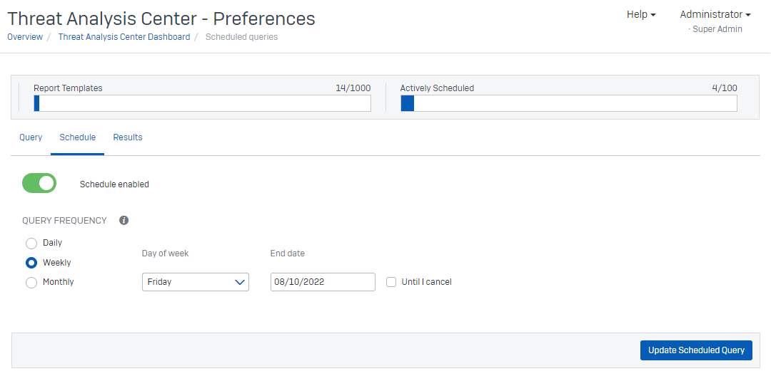新しいクエリを表示するには、「脅威解析センター > 設定」を参照して、「スケジュール済みクエリ」タブを選択します。