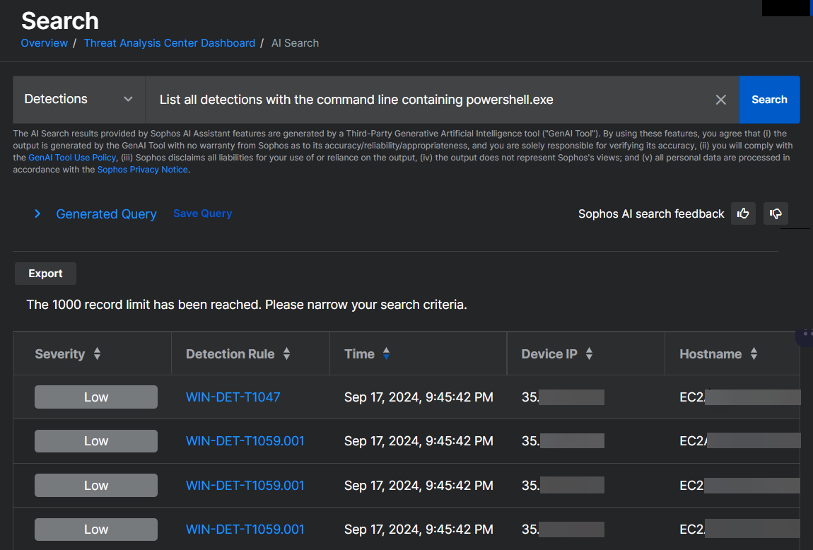 AI 検索によって、SQL クエリを書かずに Sophos Data Lake のデータを検索できます。