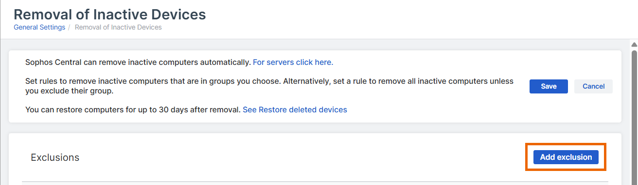 指定された時間、非アクティブ状態になっていたデバイスが自動的に削除されるように Sophos Central を設定できます。