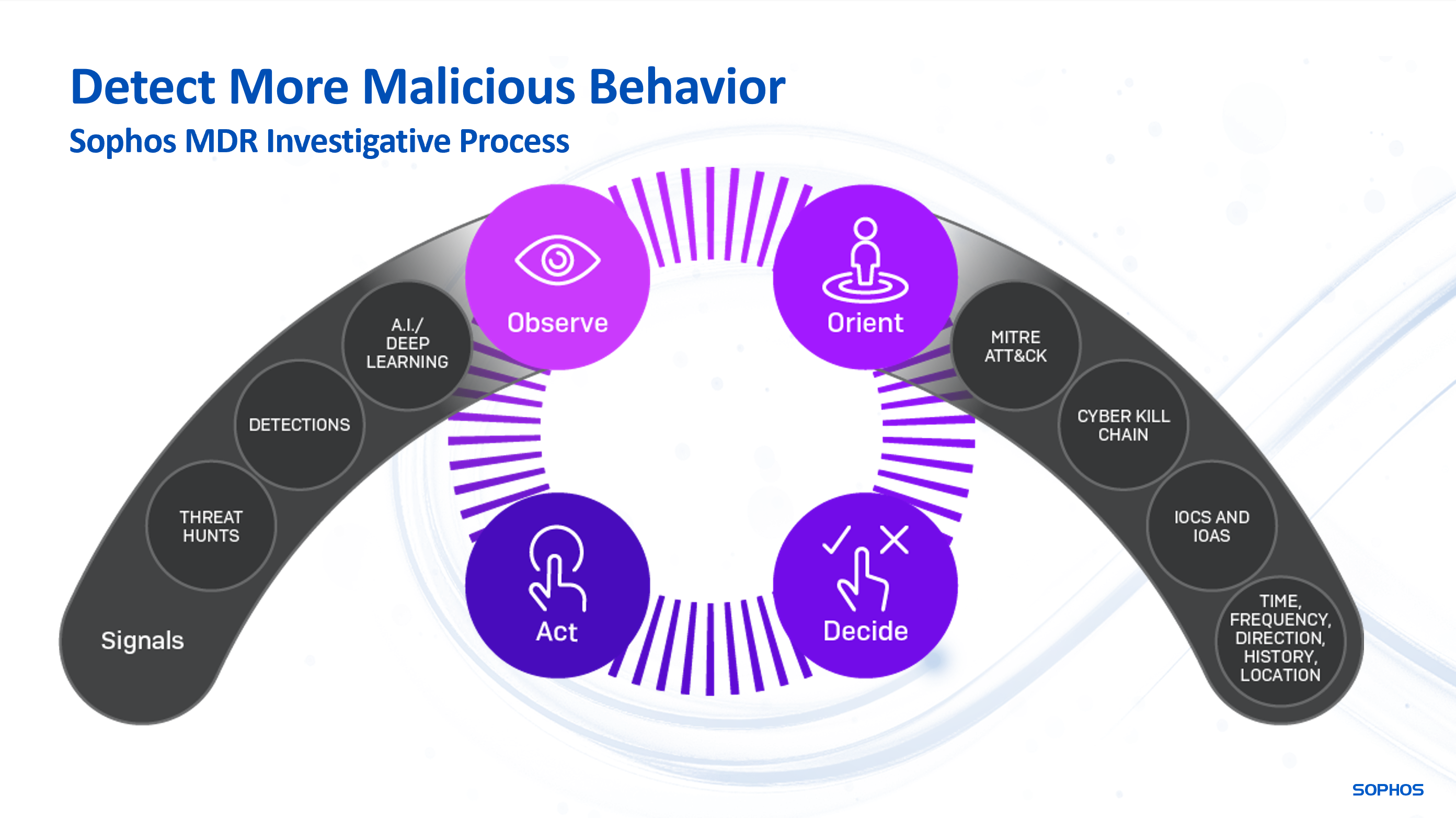 ソフォスの「調査フレームワーク」は、ケースを調査する際のガイドとしてアナリストが利用できます。このフレームワークを活用して、ソフォスの MDR 運用部門は、お客様環境内に悪意のあるアクティビティが存在するかどうかを判断する際に役立つ攻撃ストーリーを構築できます (データカバレッジとデータ品質が最大である場合)。このプロセスは、OODA (Observe、Orient、Decide、Act [観測、方向付け、決定、行動]) ループの反復的な流れに従います。