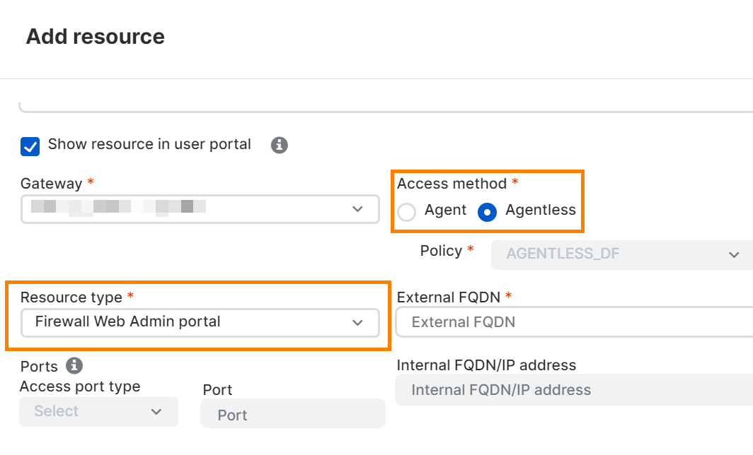 ファイアウォール Web 管理ポータルをリソースとして追加できます。この操作を行うと、エージェントレスのアクセス方法の「リソースの種類」ドロップダウンリストに「Web 管理ポータル」が表示されます。