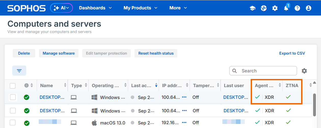 에이전트가 설치되었는지 확인하려면 장치 > 컴퓨터 및 서버로 이동하십시오. 에이전트 모드 및 ZTNA 열에는 에이전트를 설치한 장치에 대해 체크 표시가 나타납니다.