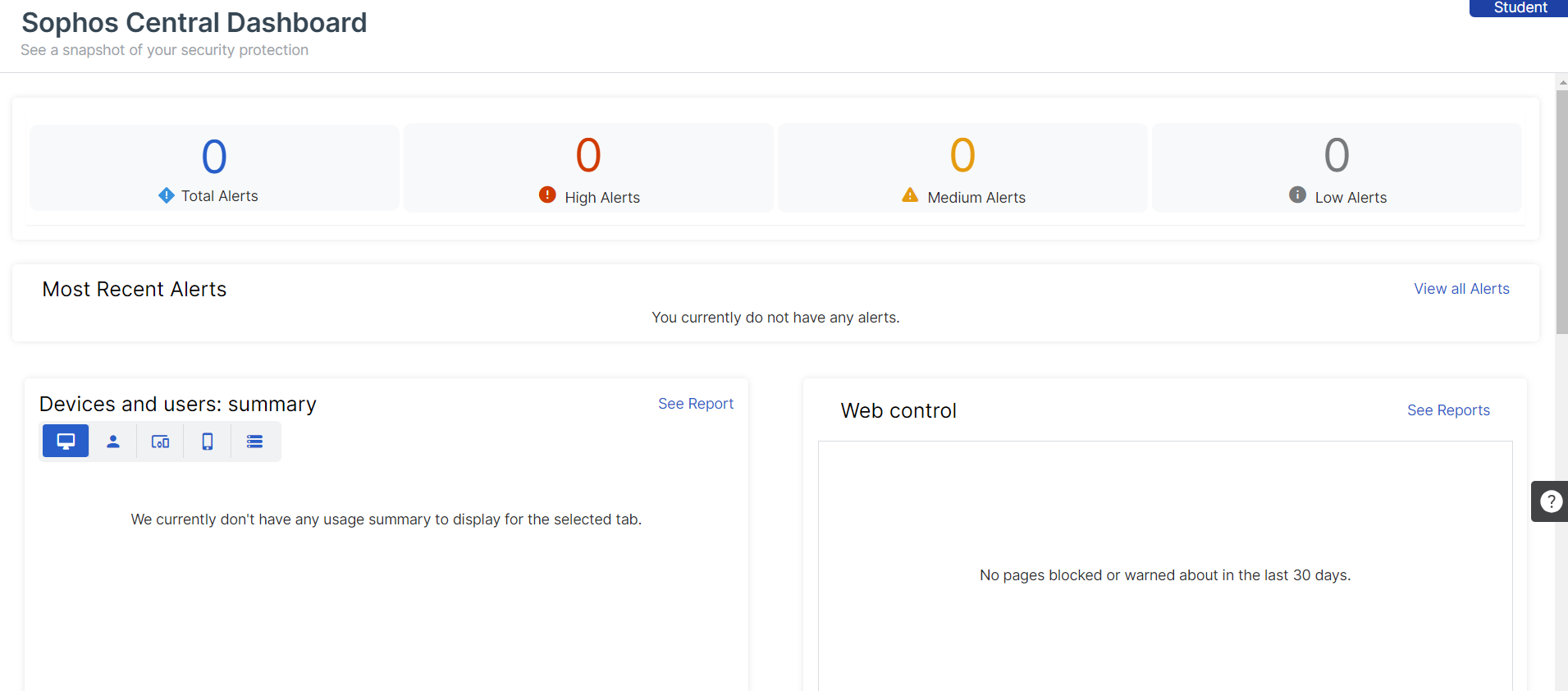 A primeira tela que você vê é o painel de controle do Sophos Central. Ele mostra alertas e atividades recentes por dispositivos e usuários.