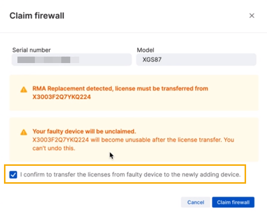 São exibidos avisos informando que sua licença será transferida para o firewall substituto e o firewall antigo ficará inutilizável.
