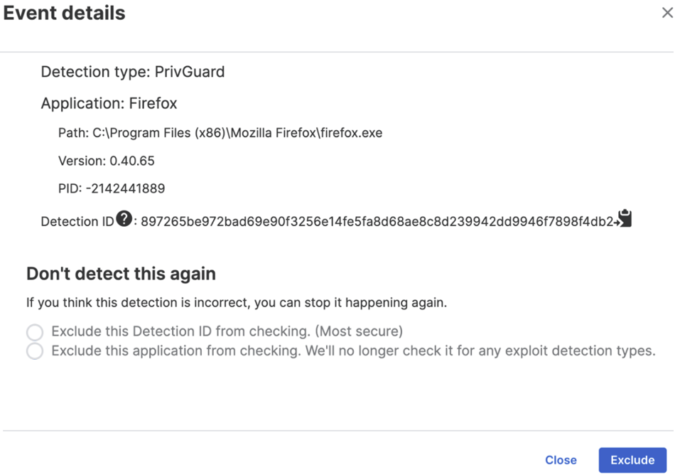 - Excluir este ID de Detecção da verificação. impede essa detecção neste aplicativo. Adiciona uma exclusão para o ID de Detecção associado a esta detecção específica. Se o mesmo comportamento ocorrer novamente na sua instalação, isso não aciona uma detecção. No entanto, se o comportamento for diferente, por exemplo, caminhos ou arquivos diferentes, o ID de Detecção será diferente e irá requerer uma exclusão separada.