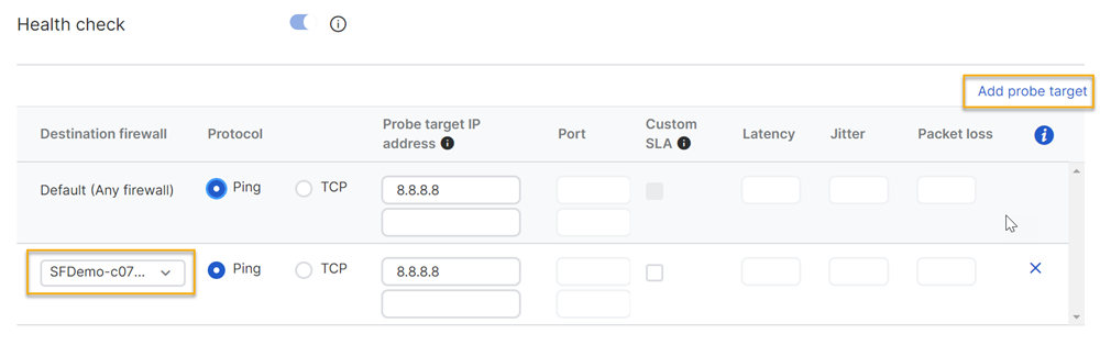 (Opcional) Clique em Adicionar destino de sondagem para especificar as configurações de verificação de integridade de um firewall específico. Siga este procedimento: