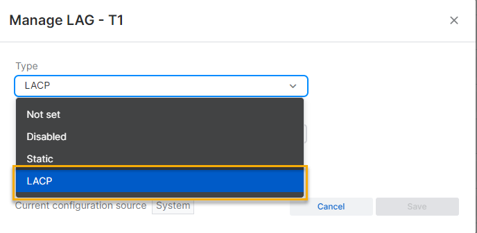 Selecione as portas a serem adicionadas ao grupo LAG no menu suspenso Portas.