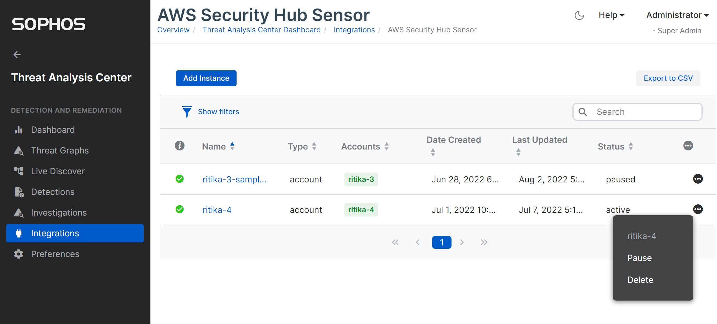 - In Sophos Central, go to Threat Analysis Center and click Integrations.