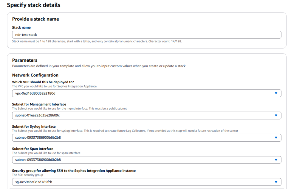 Você precisa inserir uma sub-rede para a interface SPAN, mesmo que esteja apenas configurando um coletor de log de terceiros, não o Sophos NDR. Se você não fizer isso, seu Modelo do CloudFormation não será importado corretamente.