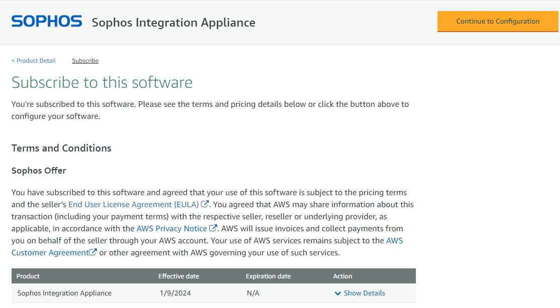Você deve se inscrever no Sophos Integration Appliance no AWS Marketplace. Isso garante que a AWS reconheça seu modelo do CloudFormation e permita que você instale seus recursos em sua conta da AWS.