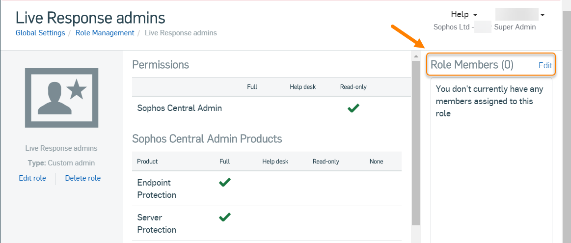 Se você selecionar o acesso Help Desk, poderá atribuir à função o direito de executar sessões do Live Response, mas não gerenciar as configurações do produto.