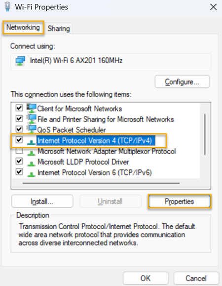 在聯網索引標籤上,選取網際網路通訊協定版本 4 (TCP/IPv4),然後按一下屬性。