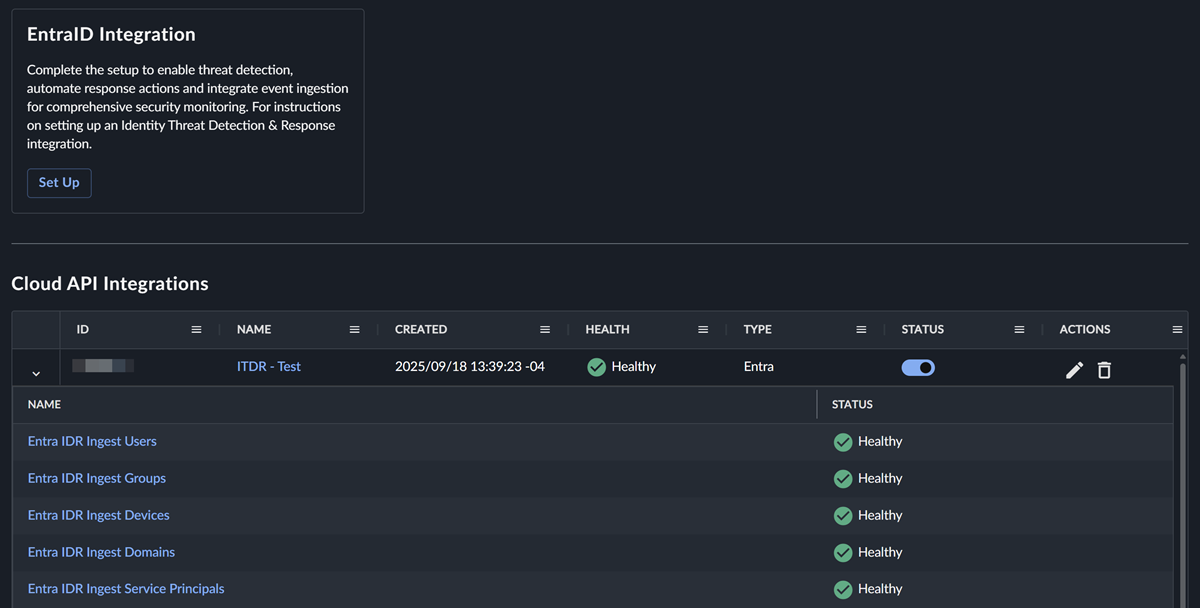 如果您已完成設定,Cloud API Integrations表格將顯示用於收集資料並對您的 Entra ID 環境執行安全評估的整合。展開一列以查看子集成和其健康狀態。