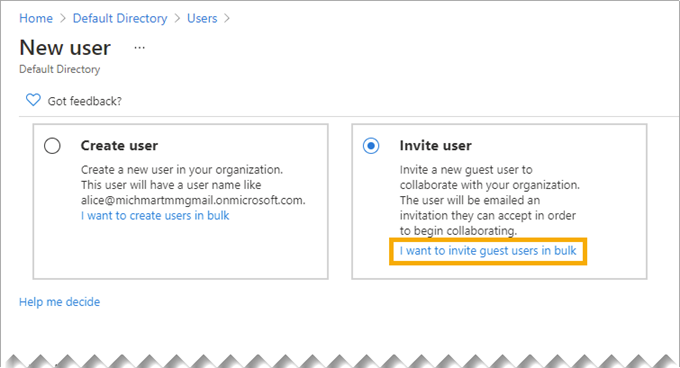 在新增使用者對話方塊中,選取邀請使用者,然後按一下我要批量邀請訪客使用者。