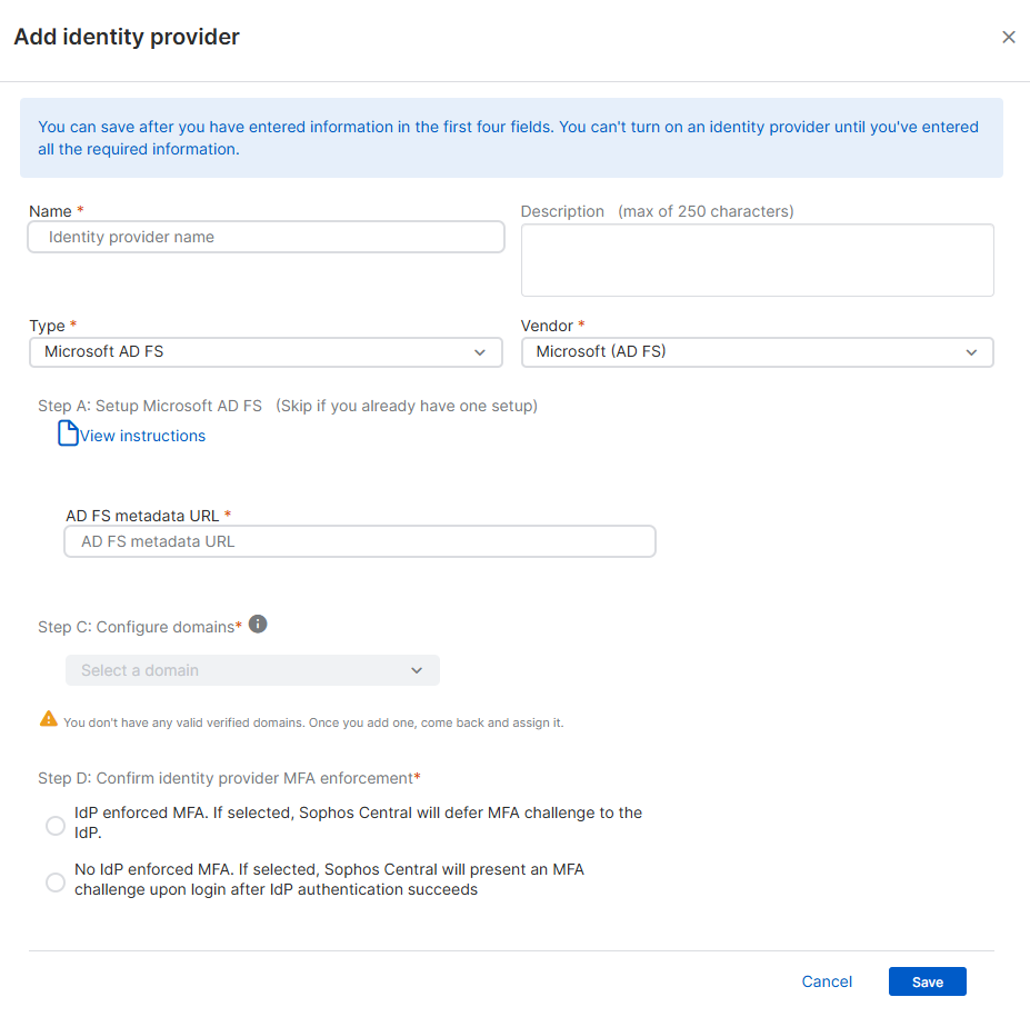 • You must verify a domain first. You can't set up an identity provider if you haven't verified a domain. See Verify a federated domain.