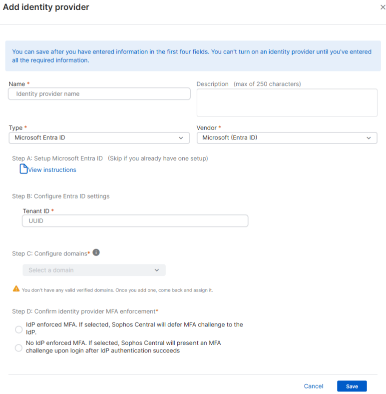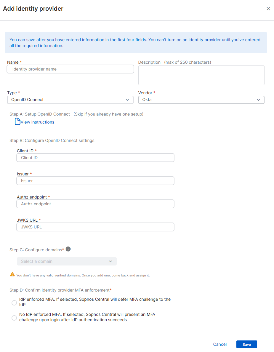 • No IdP enforced MFA: Sophos Central enforces MFA after IdP authentication is successful.