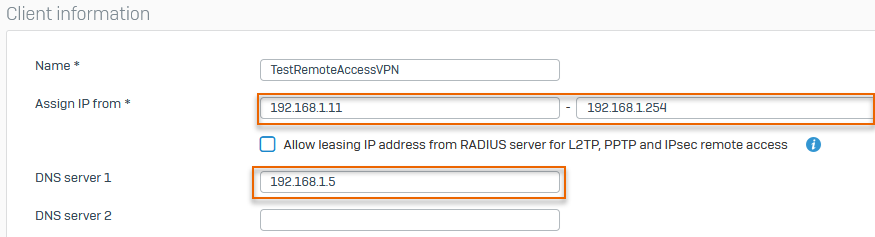 Name Example settings Name TestRemoteAccessVPNAssign IP from 192.168.1.11192.168.1.254DNS server 1 192.168.1.5 -