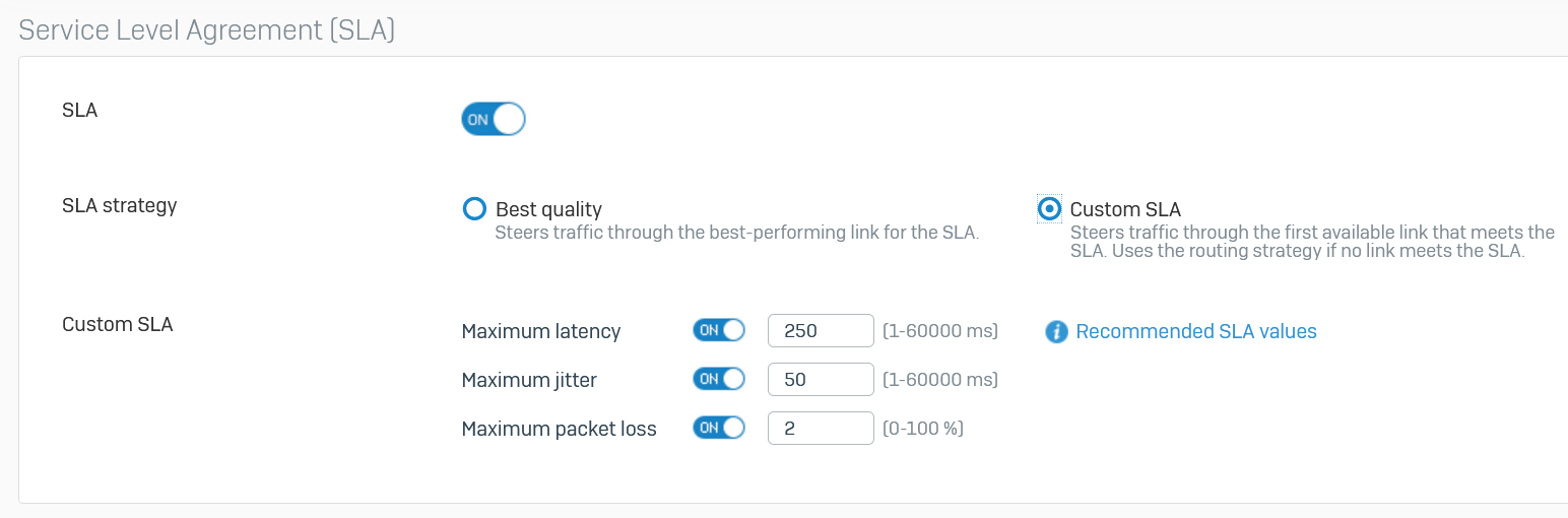Custom SLA: Select to route traffic through the best-performing link based on the custom values you define for the following: