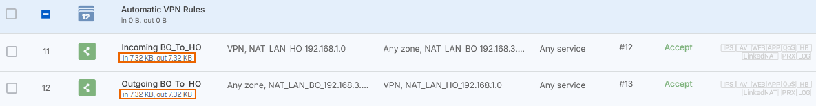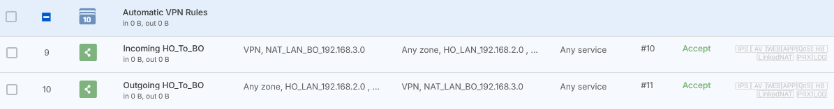 To see the firewall rules, go to Rules and policies > Firewall rules and click the Automatic VPN rules rule group. You'll see two firewall rules named Incoming HO_to_BO and Outgoing HO_to_BO.
