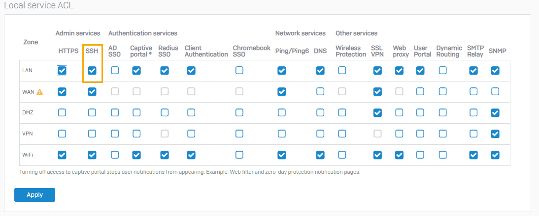 The most secure method to allow services into Sophos Firewall is creating ACL exception rules for any services you want. This is useful for allowing services in the WAN and Wi-Fi zones. See Add local service ACL exception rule.