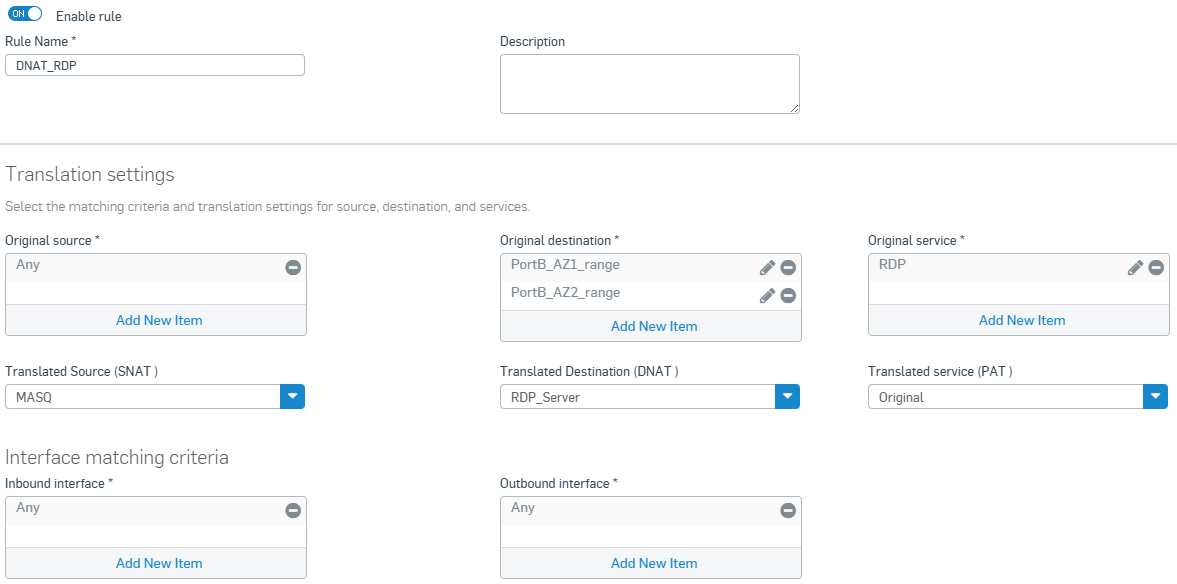 - Translated Destination (DNAT): The RDP server host you created.