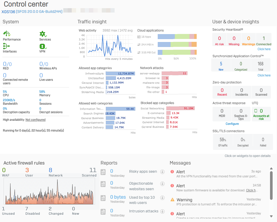 The control center appears as soon as you sign in, and shows the firewall's appliance model, firmware version, build, and serial number. It also provides a snapshot of the firewall's status and health on various widgets.
