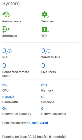 The System widget shows the real-time status of Sophos Firewall performance, services, WAN links and interfaces, and VPN connections, as well as the number of days since the firewall last started. The status is shown as an icon. Colored icons are used to differentiate statuses. Click an icon to see more detailed information.