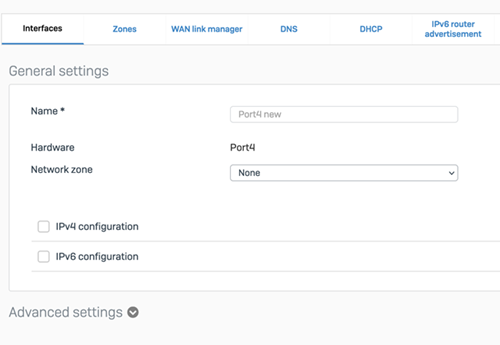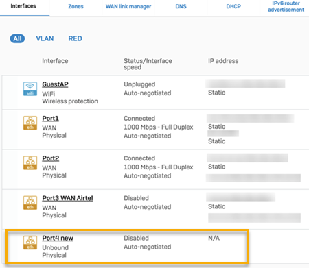 The Interfaces page shows the interface as "Unbound", the status as "Disabled", and the IP address as "N/A".