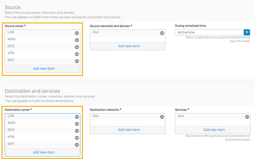 Action Drop: Drops traffic without notification. Currently, if you select Use web authentication for unknown users in the firewall rule, Sophos Firewall shows a block page rather than dropping web traffic silently. The behavior applies to traffic from all zones. Log firewall traffic Select to log all traffic that matches this rule. By default, logs are stored on Sophos Firewall. Source zones Select the zones from which traffic originates. Source networks and devices Select the source networks and devices or create new ones. Destination zones Select the destination zones in which the traffic terminates. Destination networks Select the destination networks or create new ones. Services Select the services or create a new service. Services are a combination of protocols and ports. Note