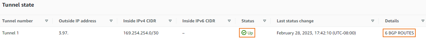4. For Tunnel 1, make sure that the State column is Up and the Details column contains BGP routes.