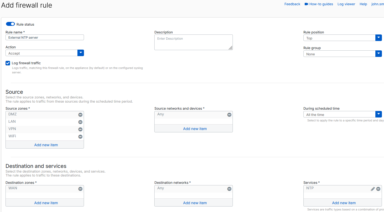 To configure a firewall rule to allow NTP traffic, do as follows: