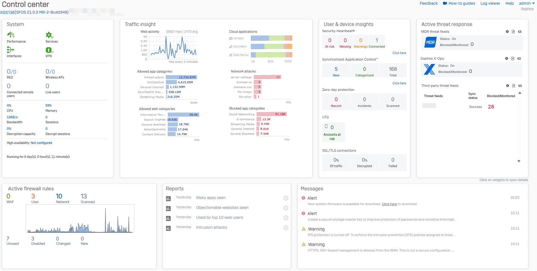 The control center appears as soon as you sign in, and shows the firewall's appliance model, firmware version, build, and serial number. It also provides a snapshot of the firewall's status and health on various widgets.