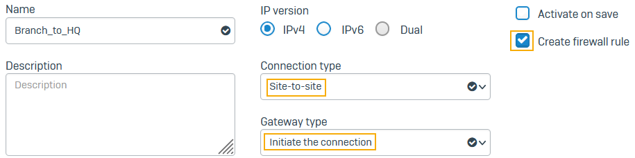 Edit the automatically created firewall rule when you saved the IPsec connection. You'll save it as a rule to allow inbound VPN traffic. Since you've set the IPsec connection to Respond only, you need a firewall rule to allow inbound traffic from the branch office.