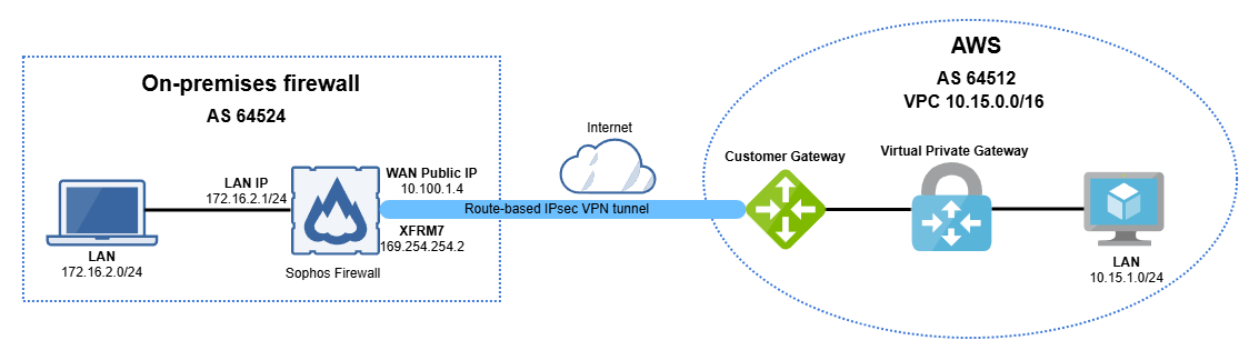 The diagram below shows Sophos Firewall and AWS VPN gateway route-based IPsec VPN connection with BGP.