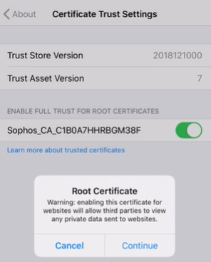 Apple では、Sophos Mobile などのモバイルデバイス管理 (MDM) ソリューションを使用して、ユーザーのデバイスに CA 証明書を直接インストールすることを推奨しています。iOS デバイスはこれらの証明書を自動的に信頼するので、ユーザーがモバイルデバイス上で CA をインストールして信頼する必要がなくなります。詳細は、Sophos Mobile を使用してモバイルデバイスにルート CA をインストールするを参照してください。