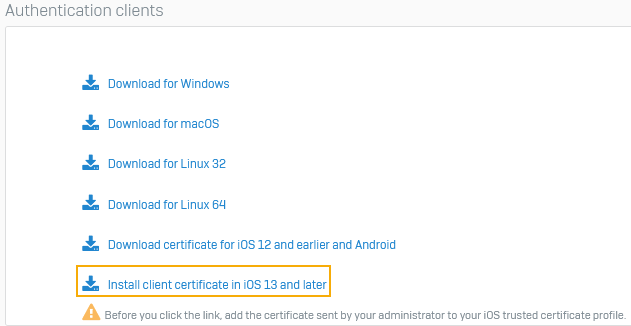 • ユーザー認証用の認証サーバーの CA: Sophos Firewall でユーザーを認証できるようにするには、クライアントに認証サーバーの CA をインストールする必要があります。iOS 13 以降のデバイスの場合、この CA 証明書はユーザーポータルから Sophos Network Agent に直接インポートします。