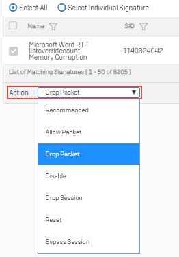 ルール内のシグネチャと一致するトラフィックが検出されたときに行う処理を選択します。パケットベースの処理の場合は、各パケットがチェックされます。セッションベースの処理の場合は、一致する最初のパケットが見つかるまで、チェックが行われます。