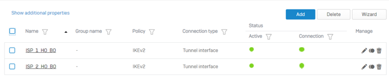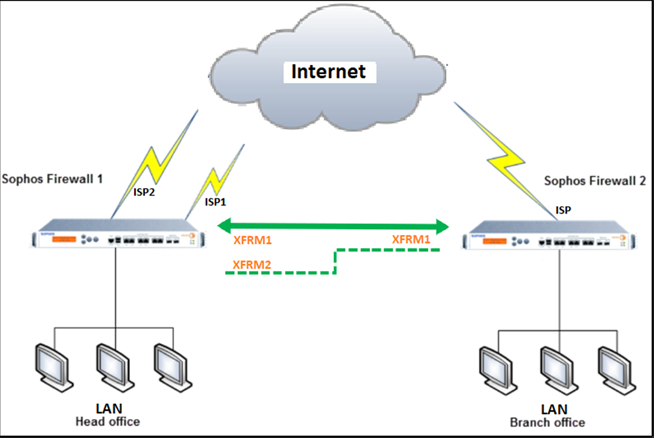 1. 本社 (HO) ファイアウォールで、ISP1 の HO と支社 (BO) ファイアウォールの間にルートベースの VPN トンネルを作成します。詳細は、ルートベースの VPN の作成 (任意のサブネット間)を参照してください。