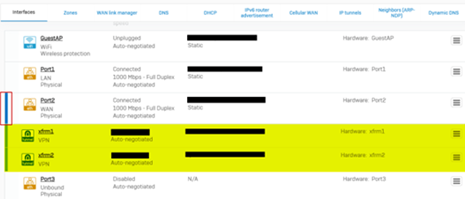 1. ネットワーク > インターフェース」に移動して、IPsec 接続作成に使用した WAN インターフェースを展開します。トンネル用に自動的に作成された XFRM インターフェイスが表示されます。たとえば、HOの場合は xfrm1 と xfrm2、BO の場合は xfrm1 と表示されます。
