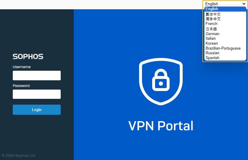 https://<Sophos Device IP Address>:443を参照します。ポート 443 は、VPN ポータルのデフォルトのポートです。管理者が別のポートを設定している場合は、その詳細が管理者と共有されます。