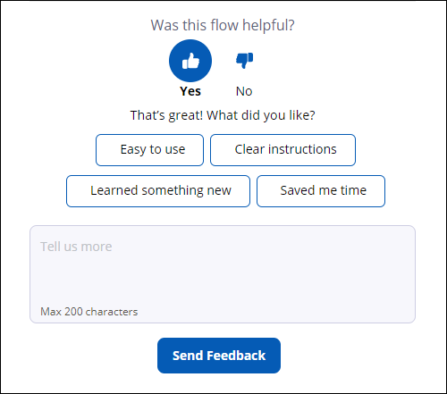 • Feature tours: Flows that demonstrate a task without performing actions. At the end of the flow, you know how to complete the task.