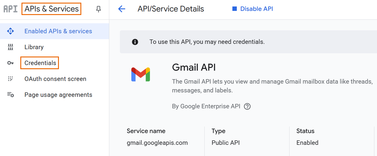 This information was correct at the time of writing. To ensure you're following the most current steps, review the Gmail documentation. See Gmail API Overview.