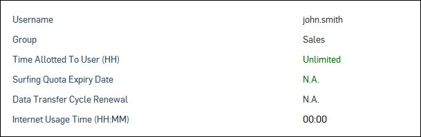 Policy information, such as user group, total surfing time allowed in hours, surfing quota expiry date, data transfer cycle renewal date, total internet time used, and guest user account expiry date (if you're registered as a guest user).