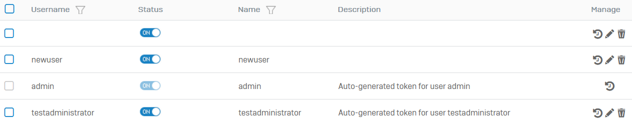 リストには、発行済みトークンとそのユーザーが次のように表示されます。