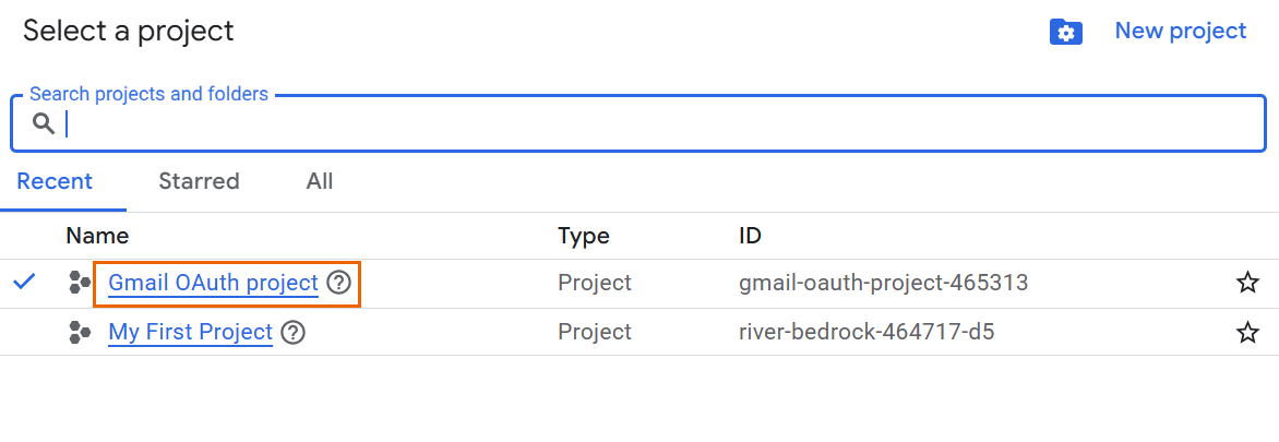 In the Select a project dialogue, click New project.