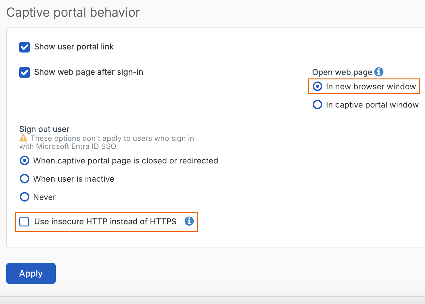 Users must explicitly sign out to end their sessions. We recommend keeping the captive portal window open for users to sign out.
