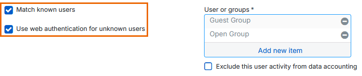 To authenticate users through Microsoft Entra ID SSO, you must select Match known users and Use web authentication for unknown users in the corresponding firewall rules.