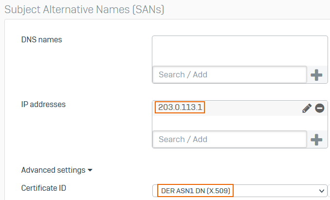 Under Subject Alternative Names, enter a DNS name or IP address and click the add (+) button.