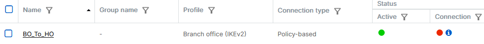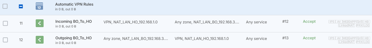 To see the firewall rules, go to Rules and policies > Firewall rules and click the Automatic VPN rules rule group. You'll see two firewall rules named Incoming BO_To_HO and Outgoing BO_To_HO.